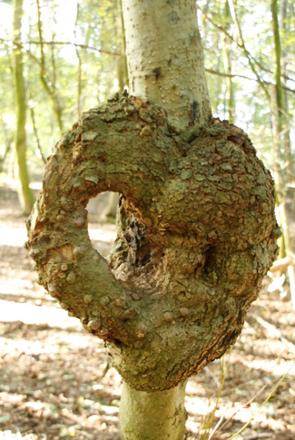 We hebben ook gallen ontdekt op de akkerdistel, de brandnetel, de hondsroos (bedeguaargal of mosgal) en op een propje van een els (elzenvlag). Maar één vergroeiing trekt wel bijzonder de aandacht: een gal in de stam van een abeel in het moerasbos (afbeelding 11). Door zijn bijzondere vorm is het een echt herkenningspunt.