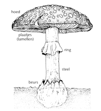 Onderdelen van een paddenstoel zijn de hoed met daarin een vruchtbare laag die de sporen produceert, de steel, de manchet (ringvormige structuur op de steel die het restant is van een beschermend vlies) en de beurs (het restant onderaan de steel van een ei-achtige structuur die jonge in ontwikkeling zijnde paddenstoelen in de beginfase beschermt).