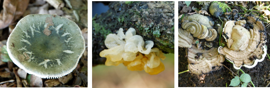 We komen er dan ook een groot aantal paddenstoelen tegen, zoals buikzwammen, korstzwammen, bekerzwammen, stinkzwammen, trilzwammen, zwavelkopjes, honingzwammen, aardappelbovisten, nevelzwammen, geweizwammetjes, houtzwammen, vliegenzwammen, bundelzwammen, judasoor en nog een groot aantal andere waar we er niet in geslaagd zijn ze te determineren. In afbeelding 13 laat een drietal voorbeelden zien.