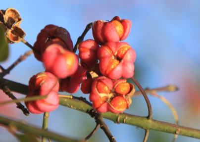 De kardinaalsmuts (ook wel verborgen oranjeklantjes genoemd) zit vol met vruchten (afbeelding . De op bloemen lijkende vruchten (rose/rood met oranje zaden, die van binnen wit zijn met een groen kiempje) worden pas later in het jaar door vogels gegeten. Onder de struik zie je dan vaak gebroken zaadjes, waaruit de groene kiempjes gepikt zijn. Dat is het werk van fazanten. De meeste vogels kiezen eerst voor andere vruchten en zaden, voordat ze aan deze zaden gaan.