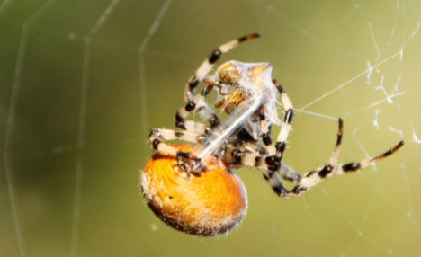 De ronde wielwebben bevatten kleefdraden om insecten te vangen. We zijn er getuige van dat een vliegje in het web terechtkomt, waar meteen een dikke kruisspin op af snelt. Het vliegje wordt door de spin vakkundig ingepakt met een brede laag spinsel, waarna de spin het vliegje naar een beschut plekje onder een blad vervoert om het daar later te verorberen.