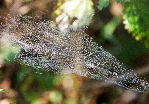 We krijgen natte voeten van de dauw. Maar de dauw maakt ook een prachtig natuurfenomeen zichtbaar: de dauwdruppeltjes blijven als minieme pareltjes hangen aan de draden van de aanwezige spinnenwebben. We zien meteen twee soorten webben tussen de verdorde akkerdistel: wielwebben en matwebben.