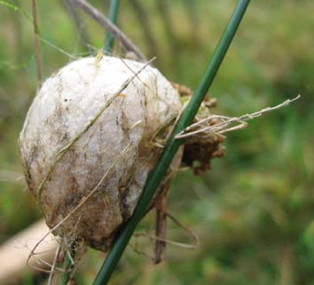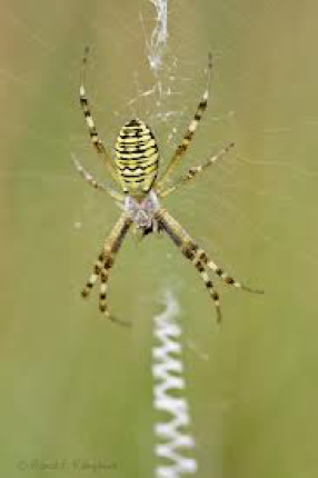 Even verderop komen we een cocon van de wespspin of tijgerspin tegen (afbeelding 8). De wespspin komt oorspronkelijk uit het Middellandse Zeegebied, maar heeft zich verspreid naar het noorden en komt tegenwoordig ook in grote delen van Europa voor, ook in Nederland, zij het niet in grote aantallen. Met name wat open plaatsen als graslanden en heidevelden zijn een geschikte biotoop.