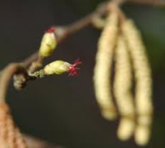 Eén struik is gemakkelijk te herkennen: de hazelaar (afbeelding 1). Aan de hazelaar hangen de mannelijke katjes uitdagend te pronken. Na goed onderzoek ontdekken we ook een paar van de minieme vrouwelijke bloeiwijzen: knoppen omgeven door knopschubben, waaruit rode draadvormige stempels steken.