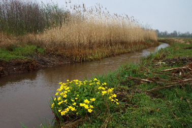 Na een aarzelend begin, barst het leven in de lente in alle hevigheid los. Bladeren ontwikkelen zich snel en in een mum van tijd staat de hele weide vol bloeiende planten. Een vroege bloeier is veldkers, die we veelvuldig aantreffen. Her en der staan polletjes boerenwormkruid en rozetten van akkerdistels. Ook zien we veel paardenbloemen, speenkruid en paarse dovenetel en bij de beek staat een flinke dotterbloem met felgele bloemen te bloeien (afbeelding 2). Even verderop zien we de pinksterbloem, echte koekoeksbloem en look zonder look.