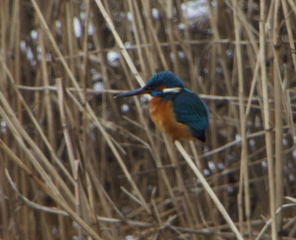 Veel dieren die actief blijven, maken een moeilijke tijd door. Het is moeilijk om aan eten te komen. We zien blauwe en zilverreigers ineengedoken langs de beek staan, op wacht om een passerend visje te vangen. Ook schiet er een ijsvogel voorbij, die verderop in het riet aan de oever een plekje zoekt (afbeelding 4).