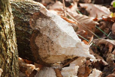 Het duidelijkst aanwezig in het hele gebied zijn wel de sporen van de bever (afbeelding 5). We zien omgeknaagde bomen, takken waarvan de bast is afgegeten, pootafdrukken, glijbanen naar de beek, wissels, twee burchten en holen in de oever van het moerasbos.
